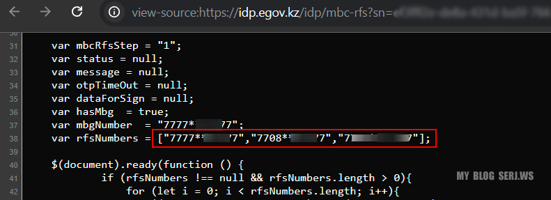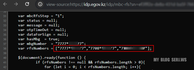 Скриншот выбора номера не сохранился, но остался исходный HTML-код страницы, на которой отображались номера телефонов, зарегистрированные на ИИН, с маскировкой формате 7705*****77, 7701*****77...